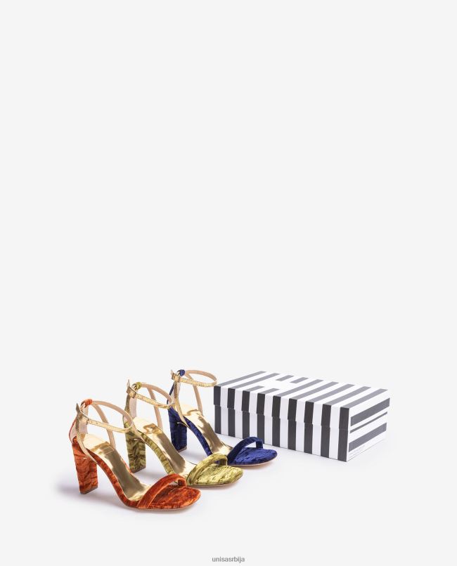 Сандале са квадратним ђоном направљене од сомота. танке златне траке за глежњеве које се могу подесити помоћу металне копче. Потпетица висине 8,5 цм обложена сомотом. кожни ђон. нова колекција униса би цхерубина очараће вас својим савршенством. <бр><бр><стронг>униса би цхерубинастронг> је наша капсулна колекција креирана заједно са брендом невесте и гостију цхерубина. дозволите да будете очарани његовим дизајном. <бр><бр>заокружите свој изглед овде.спан>